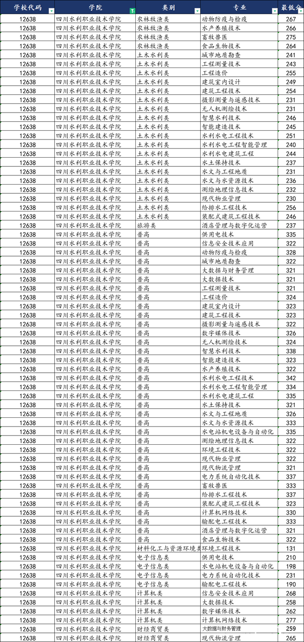 四川水利職業(yè)技術(shù)學(xué)院2024年單招各專業(yè)類別最低錄取分?jǐn)?shù)線: