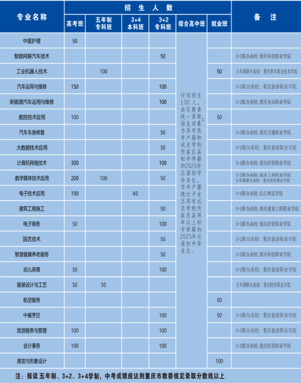 學校位于黔江區(qū)舟白街道正舟路北段503號,占地面積495畝,總建筑面積約19萬平方米。學校下轄信息技術部、汽車技術部、現(xiàn)代服務部、職教高考部四個專業(yè)部和武陵山鄉(xiāng)村振興學院以及附屬幼兒園開設有計算機網(wǎng)絡技術、汽車運用與維修工業(yè)機器人、幼兒保育、旅游服務與管理、建筑工程施工、航空服務、中餐烹飪等22個專業(yè),其中國示范專業(yè)5個,市級重點專業(yè)2個,市級骨干專業(yè)3個,市級優(yōu)質(zhì)專業(yè)6個,有職教高考班、5年制??瓢?、3+2??瓢?、3+4本科班、綜合高中班、技能就業(yè)班六種辦學層次。學校辦學理念創(chuàng)新,設施設備先進,管理依法規(guī)范,育人質(zhì)量優(yōu)良,就業(yè)渠道暢通,核心競爭力強。學校在籍學生9000余人,教職工630余人。