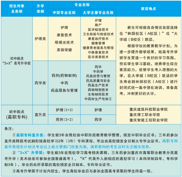 學(xué)校建有中西藥模擬藥房、中藥標(biāo)本館、中藥炮制實(shí)訓(xùn)室、藥物制劑實(shí)訓(xùn)室、基礎(chǔ)護(hù)理實(shí)訓(xùn)室、康護(hù)保健實(shí)訓(xùn)室、模擬解剖實(shí)訓(xùn)室等,可以滿足醫(yī)藥和護(hù)理類相關(guān)專業(yè)的教學(xué)實(shí)訓(xùn)需要。學(xué)校堅(jiān)持以“升學(xué)”為導(dǎo)向,目前可報(bào)考重慶建筑科技職業(yè)學(xué)院、重慶醫(yī)藥高等專科學(xué)校、三峽醫(yī)藥高等??茖W(xué)校、重慶護(hù)理職業(yè)學(xué)院、重慶健康職業(yè)學(xué)院、重慶智能工程職業(yè)學(xué)院等高校,確保我校學(xué)生100%均可參加高考升學(xué)。目前開設(shè)有初中畢業(yè)起點(diǎn)“對(duì)口高考升學(xué)班、全國(guó)高考升學(xué)班、五年制大專班”三種育人培養(yǎng)模式。