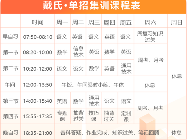 戴氏單招集訓(xùn)營嚴(yán)選經(jīng)驗(yàn)豐富、專業(yè)突出的優(yōu)質(zhì)師資組成教研團(tuán)隊(duì),根據(jù)單招學(xué)情、考情特點(diǎn)定制針對性提升方案,引領(lǐng)學(xué)員進(jìn)步。咨詢熱線:18980784372(微信同號(hào))!