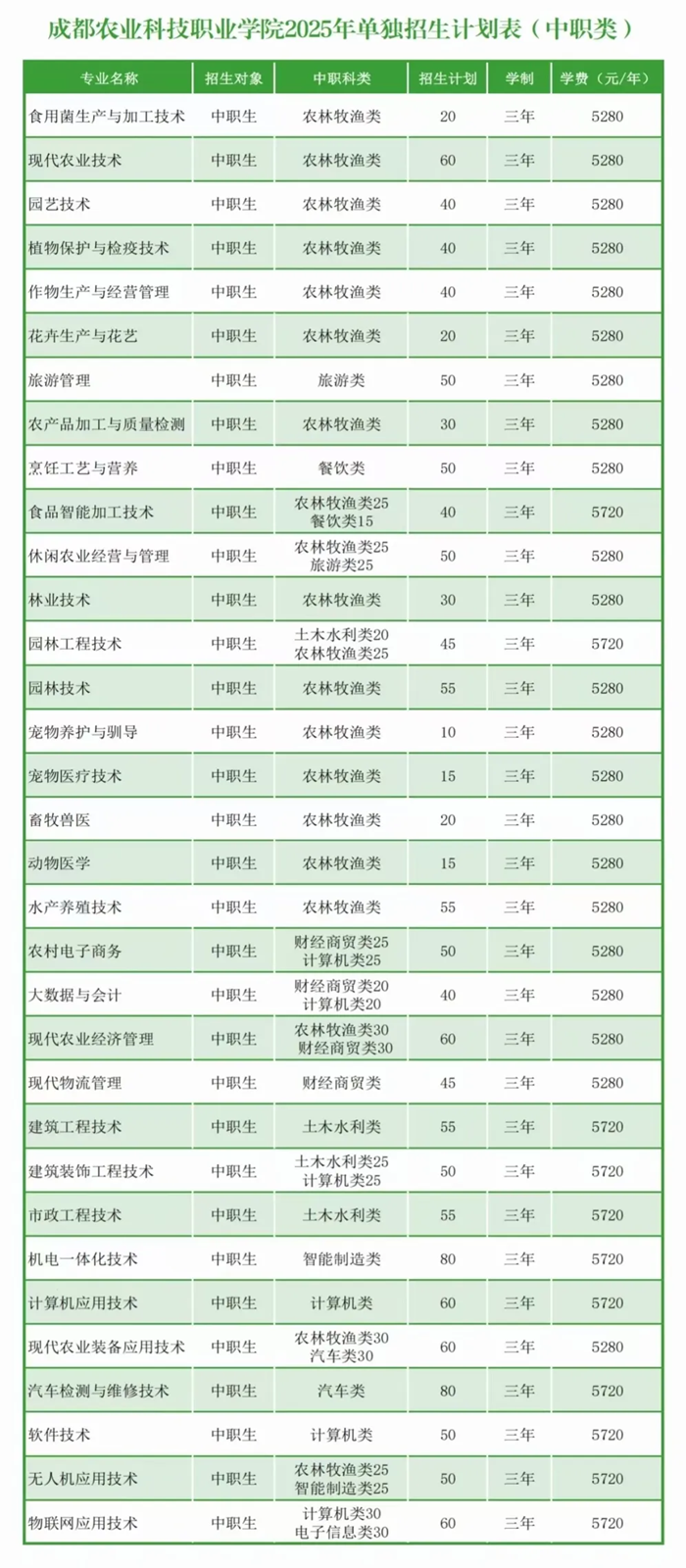 成都農(nóng)業(yè)科技職業(yè)學院2025年單獨招生簡章,招生專業(yè)及計劃,24年單招調檔線多少