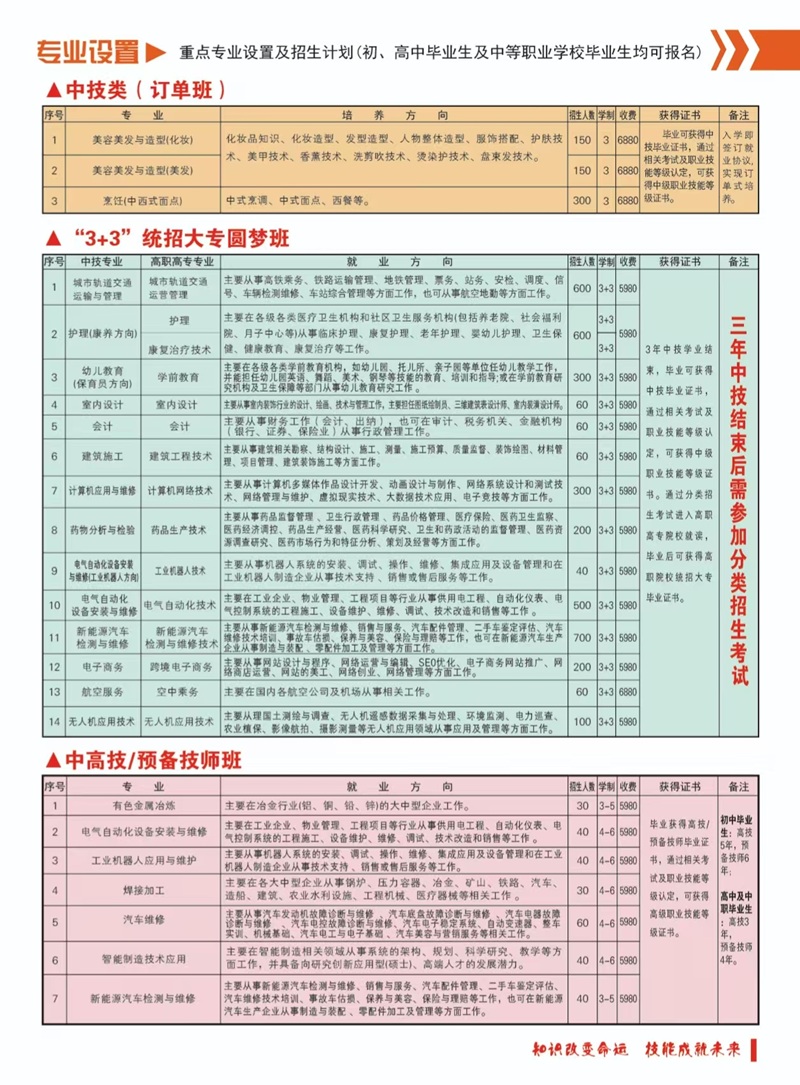 學(xué)院開設(shè)有:工業(yè)機(jī)器人應(yīng)用與維護(hù)、新能源汽車檢測與維修、無人機(jī)應(yīng)用技術(shù)、智能制造技術(shù)應(yīng)用、電氣自動化設(shè)備安裝與維修、汽車維修、計算機(jī)應(yīng)用與維修、電子商務(wù)、城市軌道交通運(yùn)輸與管理、建筑施工、焊接加工、有色金屬冶煉、藥物分析與檢驗、烹飪(中西式面點)、會計、室內(nèi)設(shè)計、護(hù)理(護(hù)工、康養(yǎng)方向)、幼兒教育(保育員方向)、航空服務(wù)等近20個中技、高技、預(yù)備技師專業(yè)。學(xué)院遵循“誠信立校、技能強(qiáng)校、文化興校、口碑塑校”的辦學(xué)宗旨,秉承“學(xué)做人之道、修立業(yè)之杰”的校訓(xùn),培養(yǎng)德技并修、技藝精湛的高素質(zhì)技能人才,學(xué)生就業(yè)率高達(dá)98%以上。