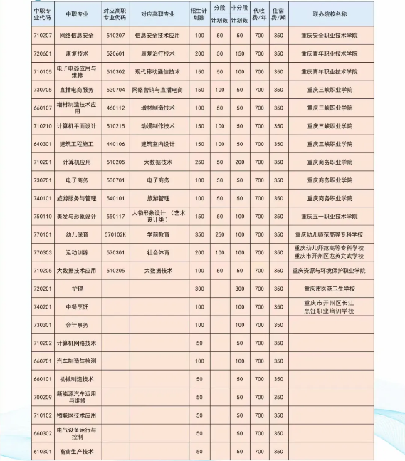 特別說明:①幼兒保育、護理專業(yè)只招收重慶市戶籍且在重慶市內(nèi)學(xué)校畢業(yè)的應(yīng)屆初中畢業(yè)生;②“3+2”中高職貫通培養(yǎng)專業(yè)只招收市內(nèi)應(yīng)屆初中畢業(yè)生。