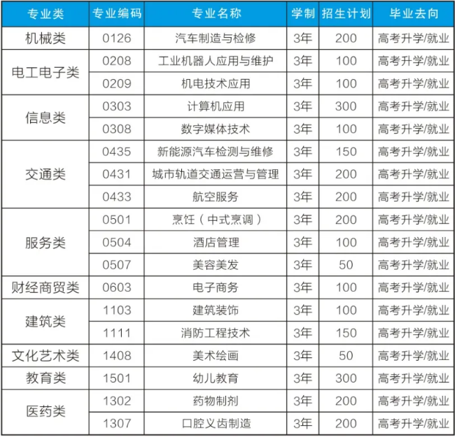 學(xué)校開設(shè)藥物制劑、新能源汽車檢測與維修、建筑裝飾、幼兒教育、數(shù)字媒體應(yīng)用計(jì)算機(jī)應(yīng)用、汽車制造與裝配、航空服務(wù)、城市軌道交通運(yùn)輸與管理等18個(gè)專業(yè)。