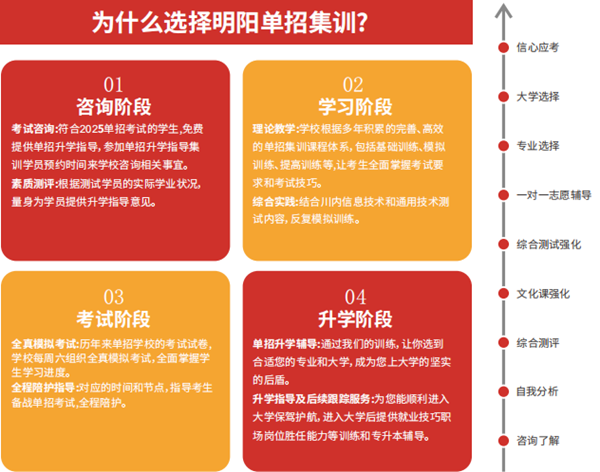 成都明陽單招培訓(xùn)學(xué)校秉承“低分高出,以公辦院校為目標(biāo)”的教育理念,為每一位同學(xué)提供更加專業(yè)、個性化的學(xué)習(xí)指導(dǎo)與職業(yè)規(guī)劃服務(wù)。多年來,我校高職單招集訓(xùn)班達(dá)到98.7%的高錄取率,2024屆“簽約班”更是達(dá)到100%的錄取率。咨詢電話——18080070332(張老師)!