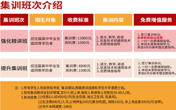 免費增值服務(wù):1、簽訂集訓(xùn)協(xié);2、一對一志愿填報指導(dǎo);3、單招未錄取繼續(xù)學(xué)習(xí)參加6月份高考暨志指導(dǎo)。