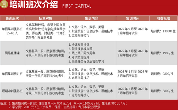 成都首創(chuàng)單招培訓(xùn)學(xué)校2026年單招集訓(xùn)班設(shè)有 “簽約班”,該班型以協(xié)議形式保障學(xué)生升學(xué)權(quán)益,專業(yè)培訓(xùn)單招“語文、數(shù)學(xué)、英語、通用技術(shù)和信息技術(shù)”等課程。詳細(xì)咨詢熱線:13540123367(招生辦宋老師)!