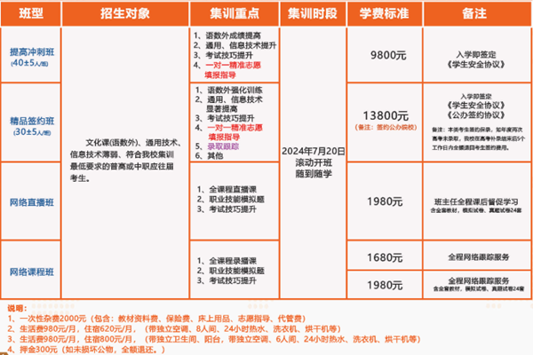 招生對象:文化課(語數(shù)外)、通用技術(shù)、信息技術(shù)薄弱、符合我校集訓(xùn)最低要求的普高或中職應(yīng)往屆考生。