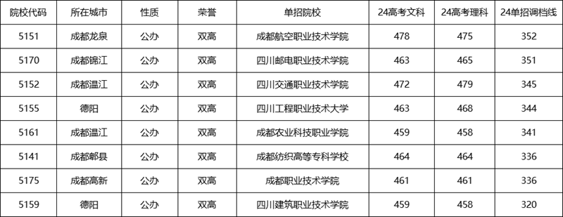 2024年四川雙高院校單招和高考調(diào)檔線對比: