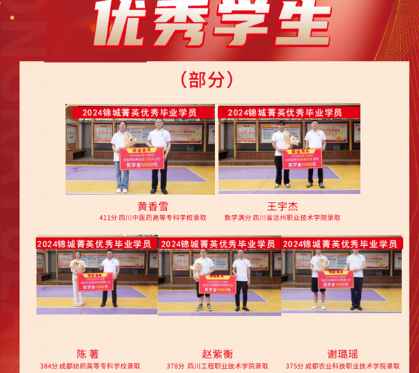 成都錦城菁英單招培訓(xùn)學(xué)校在2024年單招考試中取得了傲人的成績,公辦升學(xué)率近90%,其中我校培訓(xùn)考生黃香雪全省單招考試前三名(411分),10余名考生數(shù)學(xué)和英語單科考取100分。2025年單招考前集訓(xùn)班正在報名中,詳細(xì)咨詢:17394933667(何老師)!