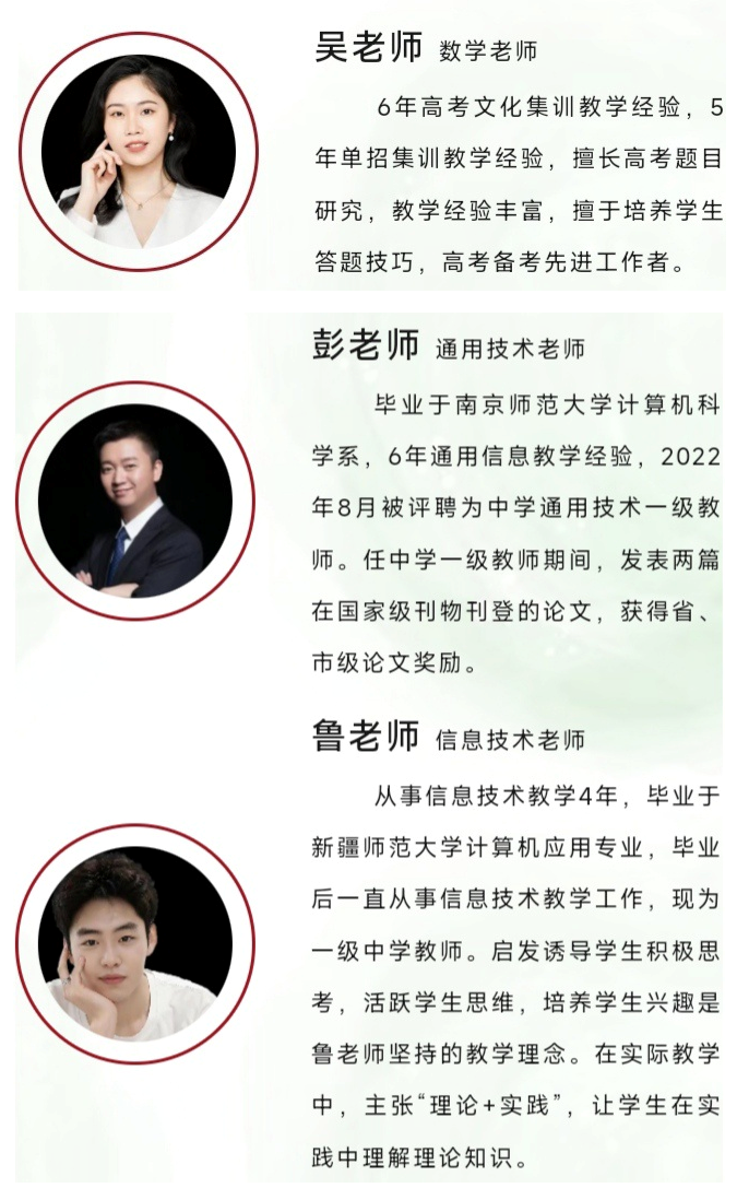 教師團(tuán)隊(duì):一支專門從事單招培訓(xùn)且經(jīng)驗(yàn)豐富的教師團(tuán)隊(duì),教師均有4年以上的單招集訓(xùn)教學(xué)經(jīng)驗(yàn),對(duì)單招內(nèi)容剖析透徹,對(duì)單招考察知識(shí)點(diǎn)和考試題型把握精確。